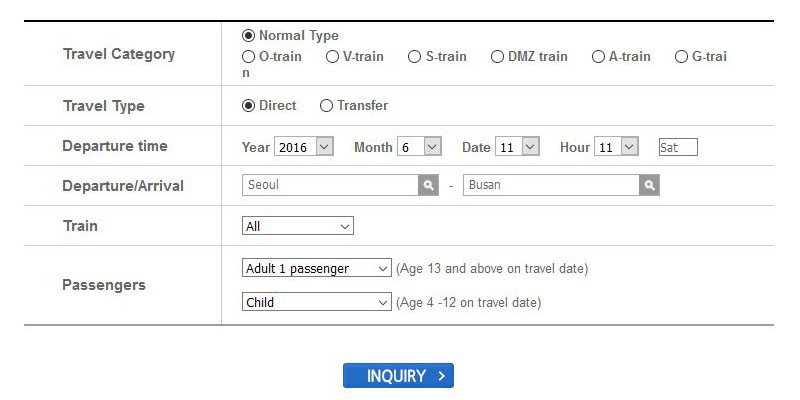 ②出発日時を入れる ![]() Normal Type (とりあえずコレを選択) Direct (乗り換えなし), Transfer (乗り換え) Departure Time (出発日時) Departure/Arrival (出発地/到着地)→③で詳しく Train (列車種別、KTXやセマウルなど ※Allが無難) Passengers (大人、小人の人数) |