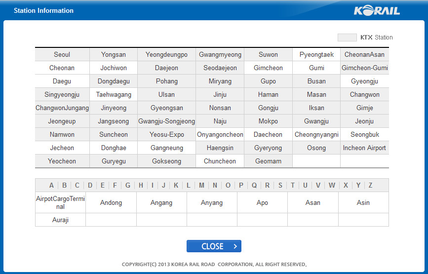 ③出発地/到着地の選択方法 例:龍山(Yongsan) → 益山(Iksan)で検索してみます。 まずDeparture/Arrivalの横にある ![]() この画面が開くので出発地をクリック。KTXの停車駅なら灰色の駅名にあるので今回は最上段にある「Yongsan」を選択。同様に到着地「Iksan」を選択。※もし地名の英語表記がわからないときは当サイトの時刻表やWikiなどを参照 |