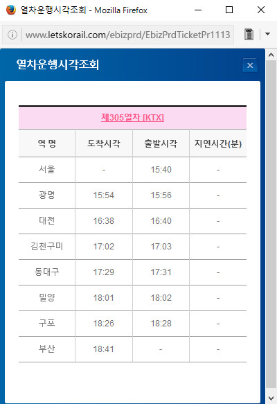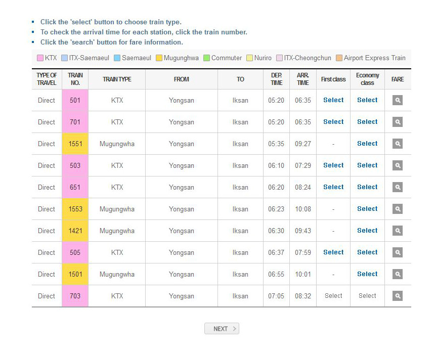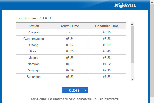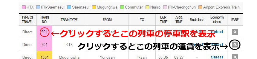 ⑤停車駅、運賃など 検索結果の画面で 「Train No.(列車番号)」(例えば701)をクリックすると該当列車のすべての停車駅と到着時刻および出発時刻が表示されます。![]() また運賃は ![]() ※龍山→益山で検索するとムグンファ号やセマウル号も表示されるのでもしKTXだけ検索したいときは「Train」で「KTX」を選択し「INQUIRY」で再度検索してください。 以上、英語版の検索方法でした。 |
