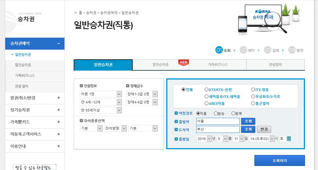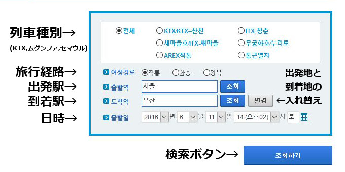 ③出発地、到着地、日時を入力 水色の枠内で![]() などの該当する項目を選択し検索します。駅名の入力は英語版と同じやり方で、駅名入力の横にある「조회」(照会)のボタンを押し、出てきた画面からハングル表示の駅名をさがしてクリック。出発地と到着地の入れ替えは「변경」を押すと一発で入れ替えてくれます。旅行経路はそのままで大丈夫です。 |